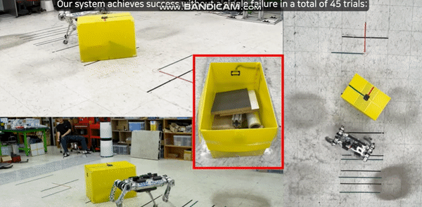 而在实际检验中,分层策略可以让一只27公斤重的机器狗用身体来移动平面上的物体,而它事先并不知道任何关于物体特征的信息。实验中,团队使用了5种不同特征的物体,包括质心会一直变化的物体——一个装了19.2公斤水的桶。