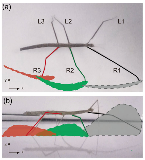 他们发现竹节虫主要呈现出三足步态模式,同时抬起三只腿。有时又转变为四足步态,即只有两只腿同时移动。它们虽然几条腿长得参差不齐,但优点是每条腿都有独特的功能。比如前腿可以除了走路还可以用来做触角,感受地面凹凸不平(真正的触角很短,眼神也不好使,没办法)。在行走时前腿会试探性地伸出去,而且抬得比较高。在不同的路面上行走,它们的步态是不一样的。如果是走在天花板上,为了避免自己掉下来,竹节虫就要保证行走时有足够多条腿与天花板接触,它会从三足步态(三条腿接触)转变为四足步态(四条腿接触)或五足步态(五条腿接触)。