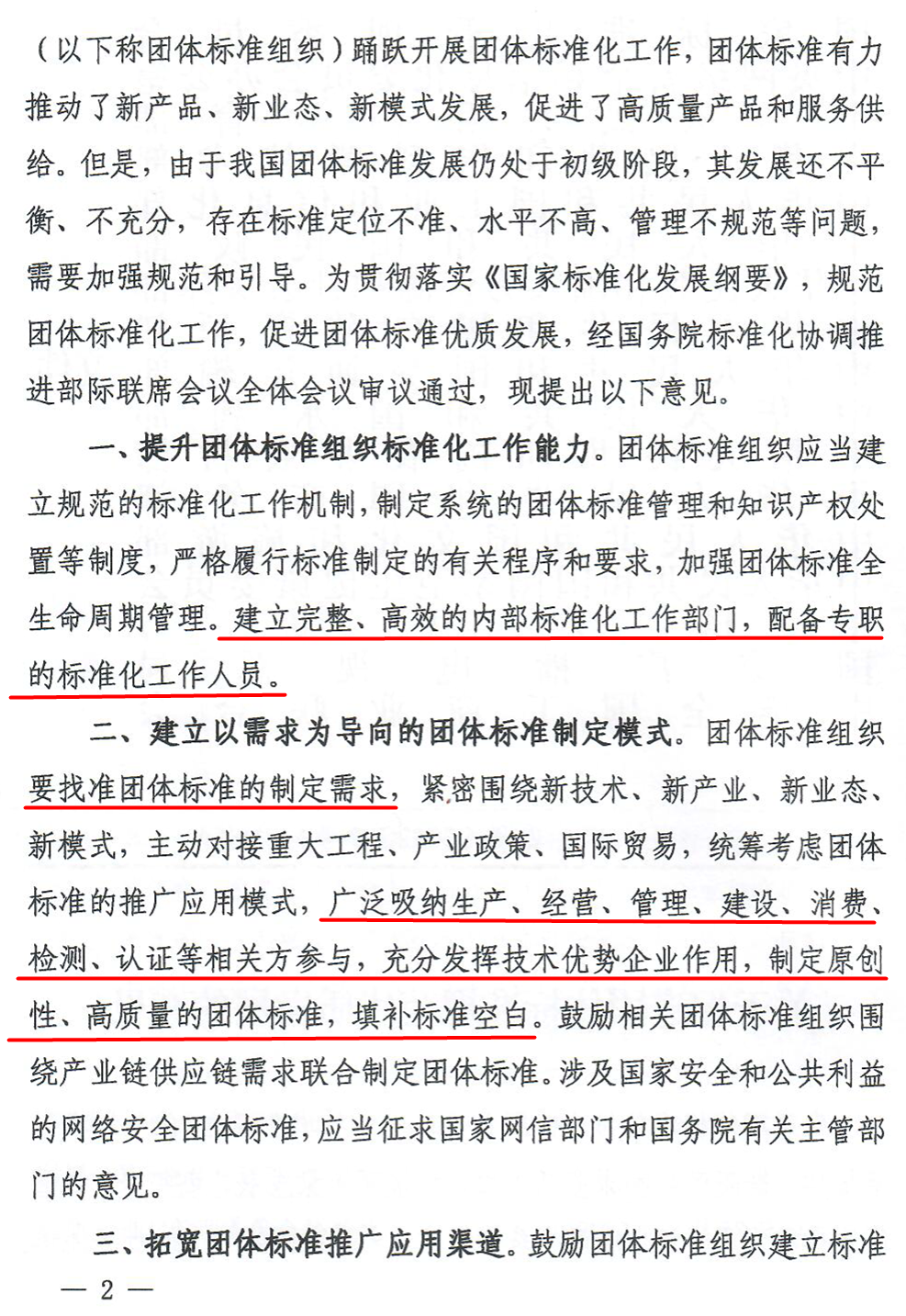 为贯彻落实《国家标准化发展纲要》,规范团体标准化工作,促进团体标准优质发展,经国务院标准化协调推进部际联席会议全体会议审议通过,国家标准化管理委员会等十七部门联合印发了《关于促进团体标准规范优质发展的意见》。
