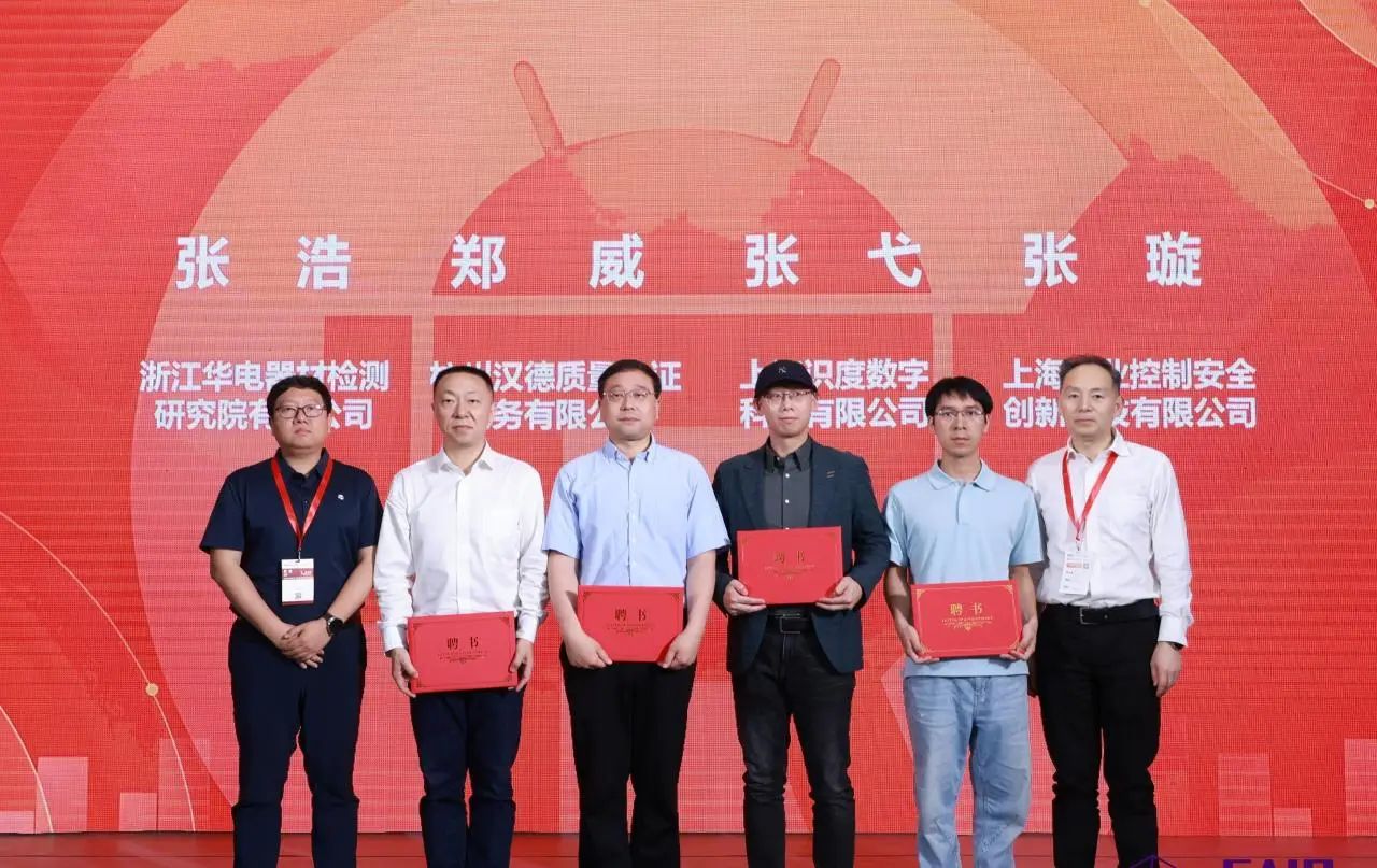 工作组组长郑军奇、副组长刘宇飞为来自浙江华电器材检测米兰·(milan)中国有限公司、杭州汉德质量认证服务有限公司、上海识度数字科技有限公司、上海工业控制安全创新科技有限公司工作组新进成员颁发专家聘书。