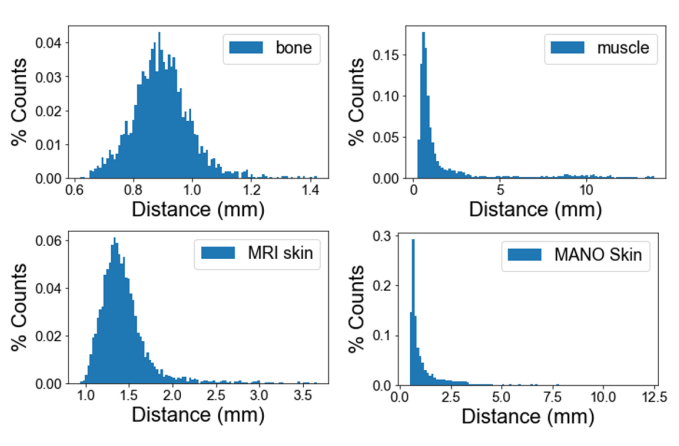 在参数学习的过程中,由于 MRI 数据的数量有限,研究者还借助了 [MANO] 模型的点云数据来扩充运动空间。通过在多个不同模态的数据集上迭代优化,之后构建出 NIMBLE 模型。与仅基于外表面的传统手部模型相比,NIMBLE 以数据驱动的方式实现了对手的内外部解剖结构统一建模。此外,模型还可以作为一个网络层应用于深度学习,以进行逼真虚拟手的生成和手势识别等多种任务。