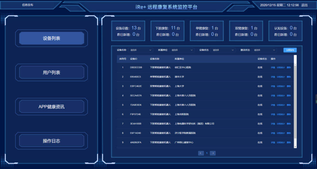 不仅如此,还可以清楚地看到是谁在使用这台设备进行康复训练,对于医生来说只要登陆云平台就能了解所有病人的康复训练情况,包括病人做了哪些康复训练、时长等详细信息。