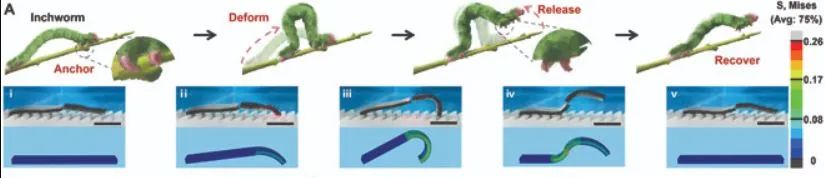 尺蠖可以用简单的身体弯曲和交替摩擦在粗糙的树枝上爬行,详细来说,就是前腿先抓住树枝,然后身体拱起弯曲时,后腿会同时向前并抓住树枝,松开前腿向前运动,再次弯曲身体,形成一个运动循环。