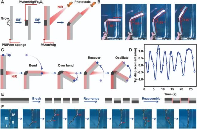 而外层的水凝胶是通过界面扩散聚合(IDP)策略在“海绵”表面被动生长的,它能够很牢固地固定在“海绵”上。这样一来,复合水凝胶能够快速响应外部温度变化,从而快速弯曲变形。