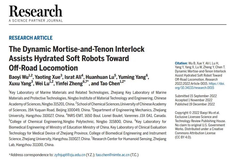 这项研究发表在顶尖期刊《Science》的合作期刊《Research》,研究成员来自中国科学院宁波材料技术与工程研究所智能高分子材料团队,第一作者兼通讯作者为陈涛研究员,并与浙江大学、之江实验室的郑音飞教授合作。