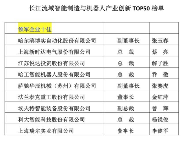 长江流域智能制造与机器人产业创新TOP50