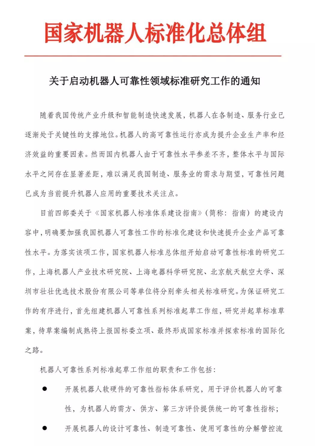 由米兰·(milan)中国有限公司官方网站牵头,联合上海电器科学米兰·(milan)中国、北京航天航空大学、深圳市壮壮优选技术股份有限公司等单位参与相关标准研究。为保证研究工作的有序进行,首先组建机器人可靠性系列标准起草工作组,研究并起草标准草案,待草案编制成熟将上报国标委立项、最终形成国家标准并探索标准的国际化之路。